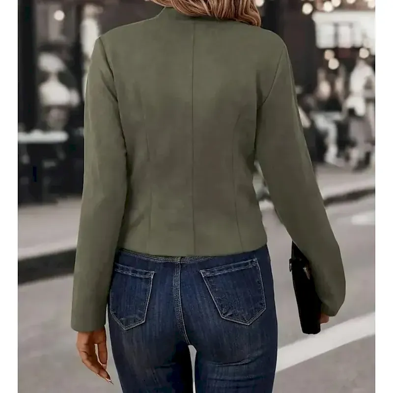 [Fabric]: Crafted from high-quality polyester, this women’s blazer offers a breathable and comfortable fit, perfect for fall and winter seasons. Its suede-like texture adds a soft, luxurious touch, enhancing the overall elegance of the garment.