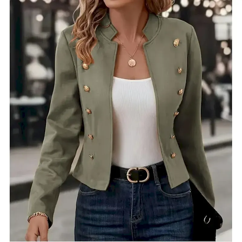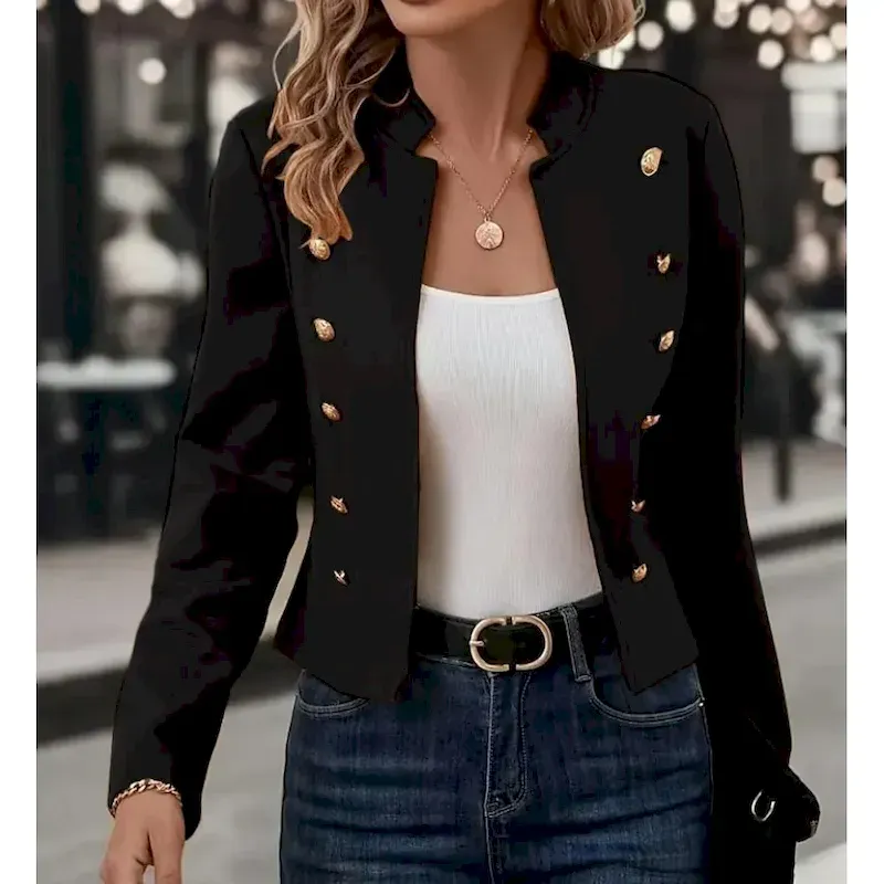 [Design Highlights]: The blazer is adorned with a stand collar and decorative buttons, arranged in a striking double-breasted style, adding a touch of sophistication to any outfit. The solid color pattern offers timeless appeal, making it a versatile choice for both modern and streetwear styles.