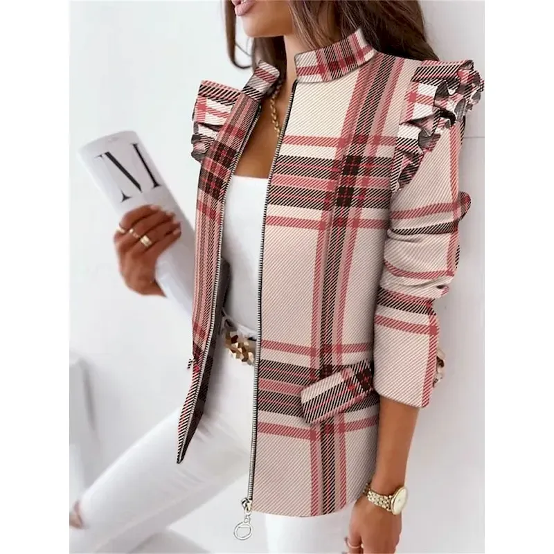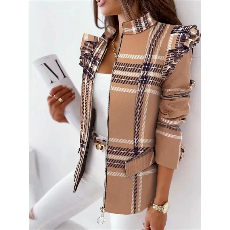 [Design Highlights]: The blazer showcases a sleek zipper closure and a high stand collar, elevating its modern aesthetic. Thoughtfully designed with subtle ruffled details on the shoulders and a regular fit silhouette, it offers a sophisticated balance between fashion-forward and timeless style.