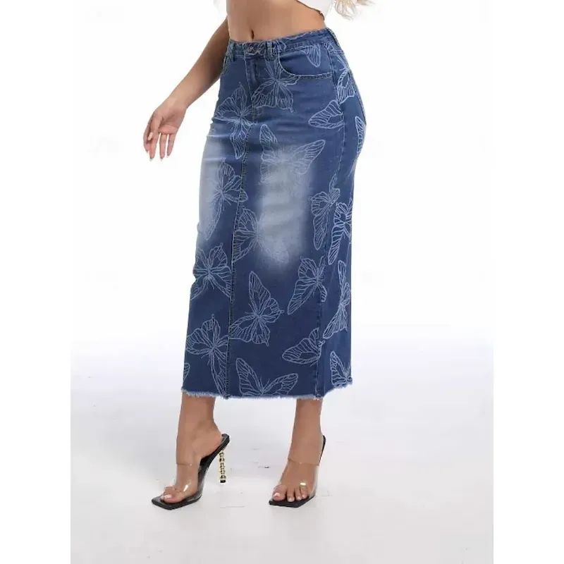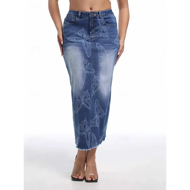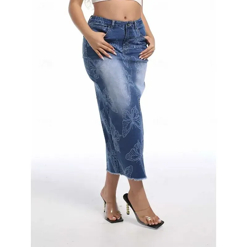 Women’s Skirt Bodycon Fashion Casual Midi High Waist Skirts Floral Pocket Print Inelastic Street Daily Blue Spring Polyester Denim