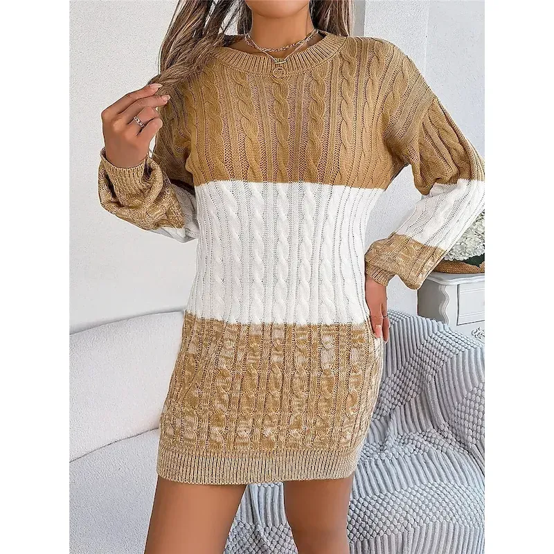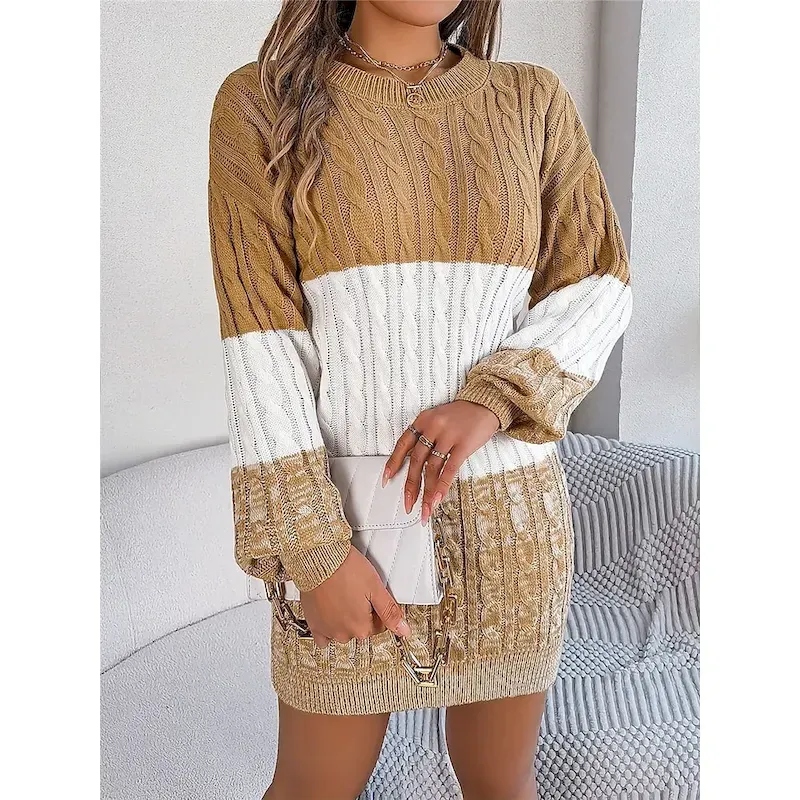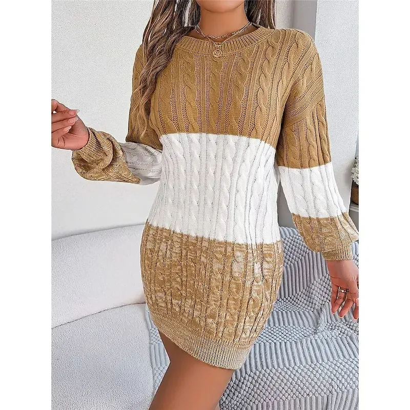 [Fabric]: Crafted from soft, cozy acrylic, this women’s sweater dress offers micro-elasticity and comfort, making it perfect for fall and winter months. The ribbed knit style ensures a snug fit while maintaining the dress’s shape after every wear.[Fit]: Featuring a regular fit, the dress is designed to lightly hug the body’s natural curves without being too tight. The long design provides ample coverage, adding to the cozy appeal, while the crew neck and long sleeves contribute to a balanced silhouette.[Design Highlights]: The dress showcases a sophisticated color-block pattern in earthy tones such as black, wine, and khaki. The cable-knit pattern adds texture and interest, while ribbed cuffs and hemline offer a neat and polished finish.[Occasions]: This versatile sweater dress is perfect for daily wear, outdoor adventures, and weekend activities. Whether you’re planning a casual day out or a more refined occasion, its effortless elegance makes it a go-to choice for cooler seasons.[Size Range]: Available in sizes S, M, and L, this sweater dress accommodates a range of body types, ensuring a comfortable and flattering fit for various figures.OK